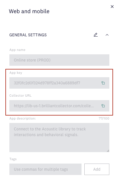 While the application key is unique for each app, the collector URL is always the same within a Connect subscription. This is where the Connect library sends all data to. We offer four collector URLs for different regions.