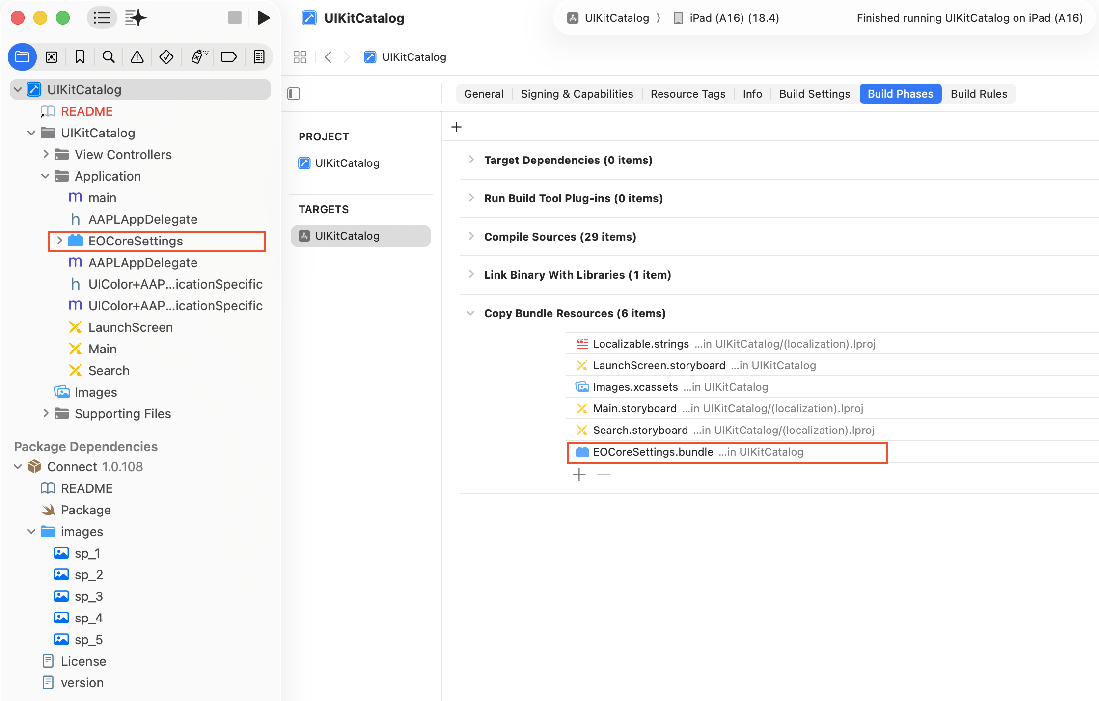- Open the primary target. On the Build Phases tab, confirm the bundle appears under Copy Bundle Resources. If it doesn't, drag it in manually.
