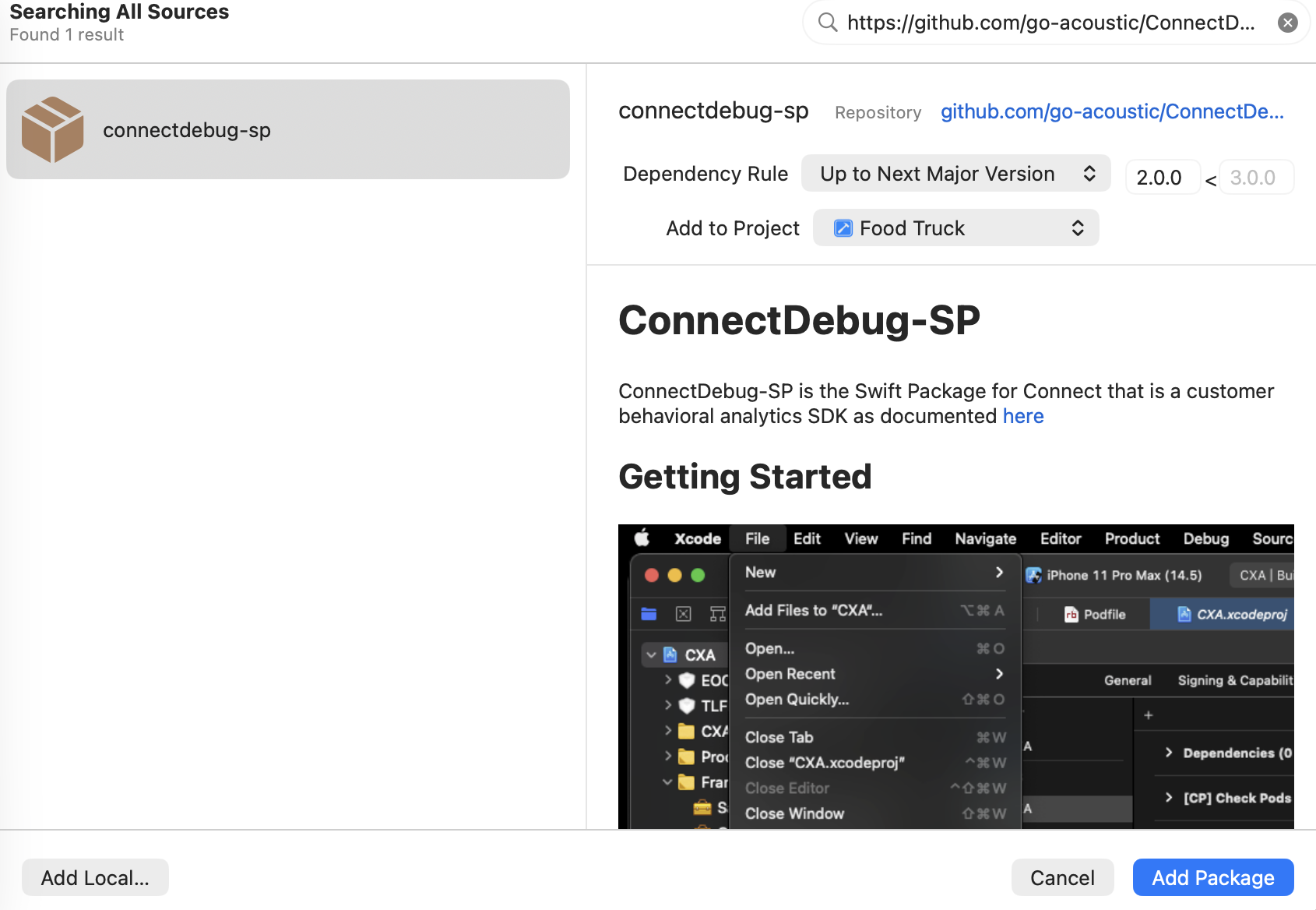 - Set the dependency rule to Up to Next Major Version from 2.0.0 and click Add Package.